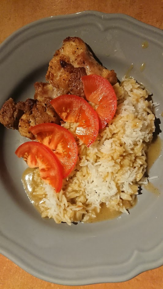 Chicken thigh filets with rice.